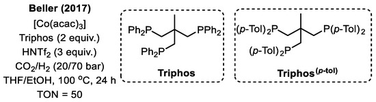 | Co(acac)3 | Triphos | 110 | 90 | THF/EtOH | 24 | 50 | [61] |