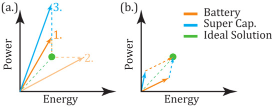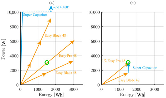 Graphical representation according to Figure 1 of the different possibilities to achieve the system goals with real values: (a) With an oversized battery or the super-capacitor module; (b) A hybrid solution consisting of the combination of the battery with an optimally designed super-capacitor module.