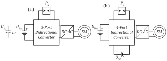 Overview of the possible connections of the energy distributions converter: (a) A 3-Port bidirectional converter for battery or super-capacitor (single energy storage system); (b) A 4-Port bidirectional converter with combination of battery and super-capacitor-module (hybrid energy storage system).