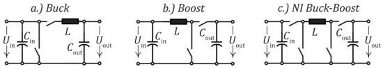 Considered DC–DC Converters: (a) Buck Converter; (b) Boost Converter; (c) Non-inverting (NI) Buck–Boost Converter.