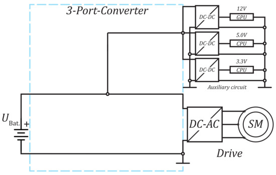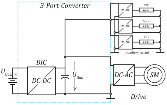 Due to the wide availability of DC–DC converters, the topology with an interface converter for the battery (Figure 7) has become established. This allows a stable bus voltage independent of the battery charge and the resulting battery voltage. The auxiliary converters can now refer to the stable bus. This has the advantage for the inverter that it can always refer to the same voltage, thus providing a constant speed range for the downstream motor. In addition, the DC–DC converter interface can be used to mitigate fluctuations such as energy recovery within the system limits.