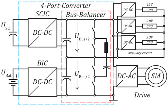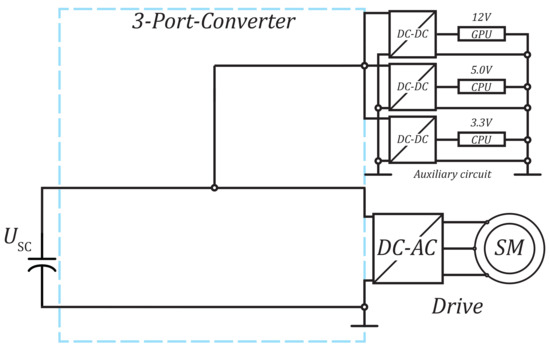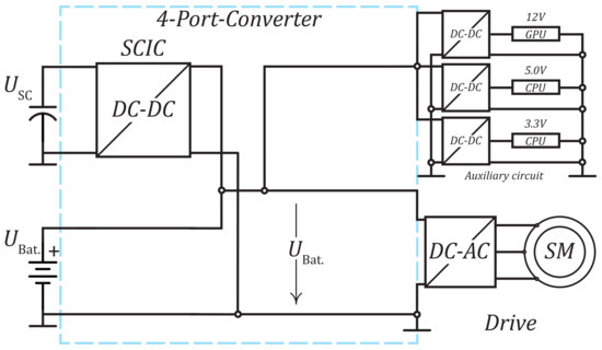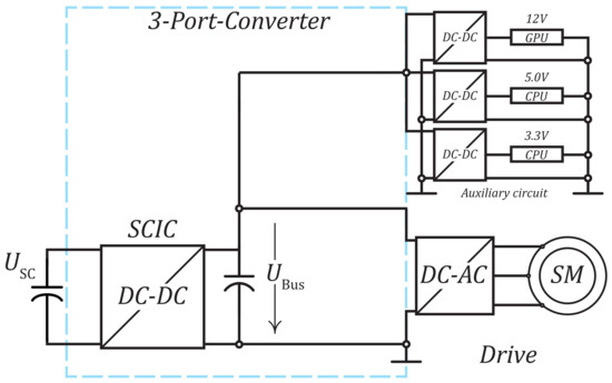 This approach of the Standard energy distribution substitute the battery with an super-capacitor compare Figure 8 with Figure 7. This also allows a stable bus voltage independent of the super-capacitor charge and the resulting super-capacitor voltage. The auxiliary converters can also refer to the stable bus. This has the advantage for the inverter that it can always refer to the same voltage, thus providing a constant speed range for the downstream motor. In addition, the DC–DC converter interface can be used to mitigate fluctuations such as energy recovery.