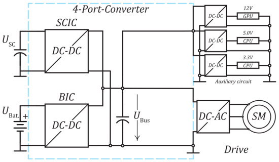 The Topology from Figure 5 is extended to include a super-capacitor module and an interface converter, as shown in Figure 9. This concept represents the first 4-Port converter in this comparison. This concept has a battery-dependent bus voltage like the first concept. In the event of recuperation, large parts of the energy peaks can be stored in the super-capacitor module via the ICSC. This stored energy can then be fed back into the system when needed.