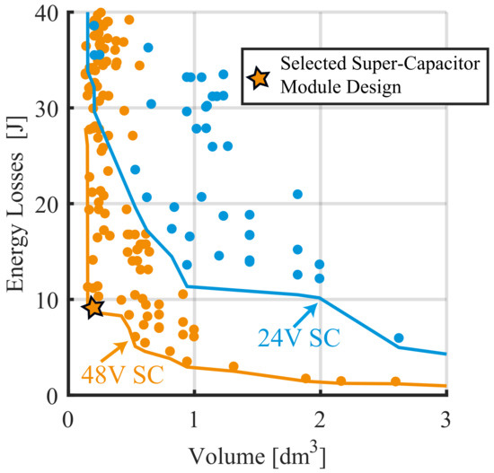Estimated super-capacitor module’s energy losses to volume Pareto fronts for 24 V and 48 V. The selected design for 48 V is represented by the star.