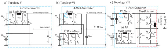 Considered Topologies with SCIC and BIC for the qualitative comparison: (a) Topology V withNI (non-inverting) Buck–Boost as SCIC; (b) Topology VI with Boost as SCIC and NI Buck–Boost as BIC; (c) Topology VIII with PP (partial power) Boost as SCIC and NI PP Buck–Boost as BIC.