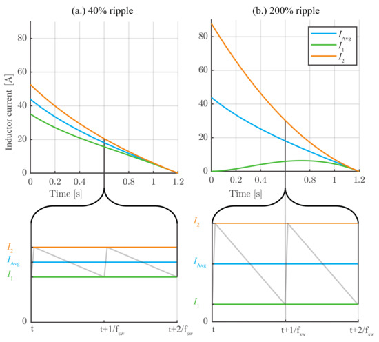 Boost and PP Boost super-capacitor inductor () current and ripple envelope during energy recovery braking process for two different initial voltage ripples, (a) 40% and (b) 200%, based on a 48 V super-capacitor design.