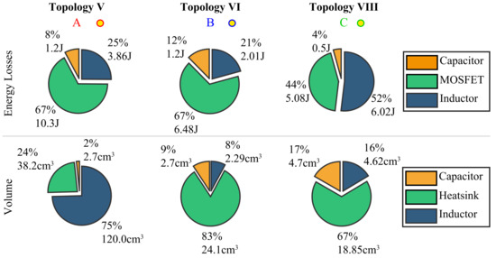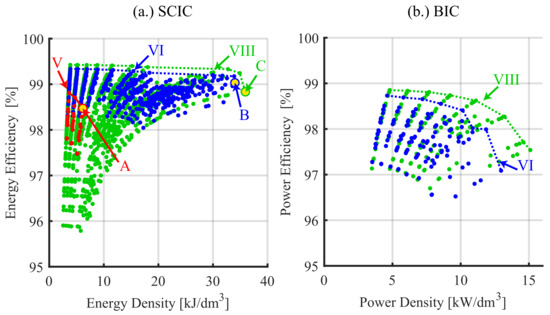 Figure 16a depicts the energy efficiency and energy density Pareto fronts for the SCIC of topologies V, VI, and VIII. Topology V has the lowest Efficiency/Density trade-off with 6 . This result is expected due to the lack of BIC, and the Bus voltage is directly connected to the battery, with a variable voltage which deteriorate the worst case scenarios for loss estimation. In addition, the converter is required to boost and reduce the voltage, so the NI Buck–Boost topology is needed, which has more devices and worse performance. On the other hand, topologies VI and VIII have a controlled bus voltage and therefore higher efficiencies and densities in comparison to Topology V. Finally, Topology VIII has the best trade-off because of the use of the partial power structure, where voltages are reduced while currents remain constant for the same power and energy. A maximum energy density of 35.94 can be achieved with this topology, with an estimated energy efficiency of 98.83%. Figure 17 shows the breakdown of energy losses and volumes for the maximum energy density designs, A, B, and C in Figure 16. It can be noted that for topologies V and VI, the MOSFET losses are dominant and for topology VIII, and they represent 40% of the total losses. Because of this, all the Pareto front results have a switching frequency of 100 []. The Pareto front analysis of the BIC is depicted in Figure 16b. Topology V is not included as it does not have a BIC. These Pareto fronts are calculated with the peak power as reference instead of the total braking energy. Therefore, the efficiencies cannot be directly compared with the ones in Figure 16a. For these Pareto fronts, the partial power topology VIII has improved efficiency and maximum density in comparison to the topology VI. The maximum power density estimated is 15 with an efficiency of 97.53%.