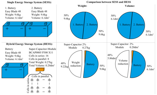 As conclusion for the comparison, it can be stated that the SESS have very oversized designs for the battery or super-capacitor module, as it can be seen in Figure 1 and Table 1. Batteries can be oversized in peak power or peak energy specifications, and super-capacitors will always be oversized in peak power. In Figure 18, a summarised comparison of the volume and weight of the storage system for ESS and HESS is depicted. The ESS design has two identical batteries (Easy Blade 48) to achieve the required peak power specification (3000 [W]). In the HESS design, the second battery can be substituted by a super-capacitor module. Both requirements of peak energy and peak power are met without any over-sizing. It can be noticed in Figure 18 that the total reduction in weight and volume achieved is 48%. In addition to these quantitative improvements, the lifetime of the battery is increased by reducing the total amount of charge cycles that are now handled by the super-capacitor. Super-capacitor technology is more adequate for a high number of charge cycles. Therefore, the overall lifetime of the system is improved.