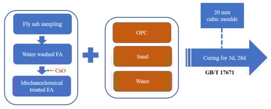 In accordance with the Chinese standard (GB/T 17671), after mixing, the mortar was poured into steel molds. Then, the molds were cured at 20 °C with 95% relative humidity for 24 h. After the mortar had cured, it was taken out from the mold and placed in water with a constant temperature of 20 °C. Compressive strength tests of mortar samples were performed after 3 and 28 days according to GB/T 17671. The pretreatment and experiment process is shown in Figure 1. The heavy metal leaching concentrations were also tested by ICP.