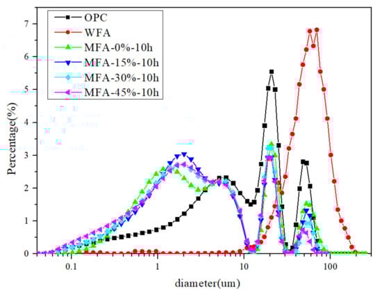 Figure 2 and Table 2 shows the particle size distribution of the OPC, WFA, and MFA. The average particle size of the WFA is 56 μm, which is larger than that of OPC (8 μm). With the treatment of the mechanochemical method, the average particle size decreases to 2–5 μm, showing three peaks of the treated fly ash. When the average particle size is lower than 10 μm, the force between particles increases significantly, and the particle size does not decrease but remains in a reasonable range [39].