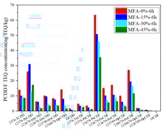 By analyzing the PCDD/Fs fingerprints in the raw and treated fly ash, changes in the contents of 17 kinds of 2,3,7,8-polychlorinated toxic PCDD/Fs were observed. According to Figure 4 and Figure 5, after 6 h of ball milling without CaO addition, the OCDD content decreased by 29.6%, while after 10 h of ball milling, the OCDD content continued to decrease to 1.295 ng TEQ/kg, resulting in a degradation rate of 41.2%. In addition, MC treatment has an obvious effect on the degradation of 1,2,3,4,6,7,8-HpCDD, 1,2,3,4,6,7,8-HpCDF, and OCDF. This shows that without additives in the MFA-0%, the PCDD/Fs can still be degraded, and when CaO is added, the CaO in the raw fly ash can help to dechlorinate the PCDD/Fs [40].