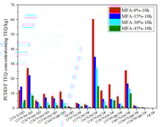Figure 4 and Figure 5 show the changes in the toxicity equivalent of 17 toxic PCDD/Fs under four different working conditions. It can be seen from the figure that mechanochemistry treatment has a significant degradation effect on 17 toxic PCDD/Fs toxic equivalents, and the largest contribution of the toxicity equivalent is still PCDFs, especially 2,3,4,7,8-PeCDF, which is approximately 30%. It is worth mentioning that mechanochemistry has a light effect on degrading low-chlorinated PCDD/Fs, especially 2,3,7,8-TCDD, 1,2,3,7,8-PeCDD, and 2,3,4,7,8-PeCDF. The reason may be that on the one hand, high-chlorinated PCDD/Fs are easily converted into low-chlorinated PCDD/Fs, which exhibit higher toxicity [29]. On the other hand, the chlorine at position 2,3,7,8 is not easy to remove, and its toxicity factor is relatively high, resulting in a high TEQ concentration [42].