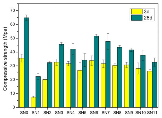 Table 4 shows the leaching concentrations of heavy metals in the cement mortar under different working conditions. The results show that the leaching concentrations of heavy metals under all working conditions are quite low. Comparing SN1 to SN0, the 35% fly ash addition can increase the leaching concentration of cement mortar. When MC-treated fly ash is added, the leaching concentrations of heavy metals in cement mortar are much lower than those substituted by raw fly ash. The results of SN3–SN5 indicate that the amount of treated fly ash that is added has an important influence on the leaching of heavy metals in the cement mortar, even though all the values meet the standard. With increasing CaO amounts, the performance of the treated fly ash shows a better stabilization effect on heavy metals. The leaching concentrations of heavy metals in SN6–SN11 are much lower than those prepared by pure cement, indicating that MC-treated fly ash can be used in building materials, such as cement raw materials and concrete.