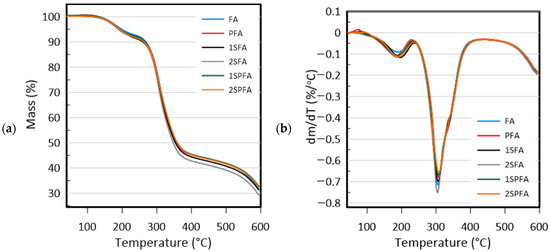 | Sample | T1% (°C) | T5% (°C) | T10% (°C) | T50% (°C) | TDTGmax (°C) | Residue at 600 °C (%) |