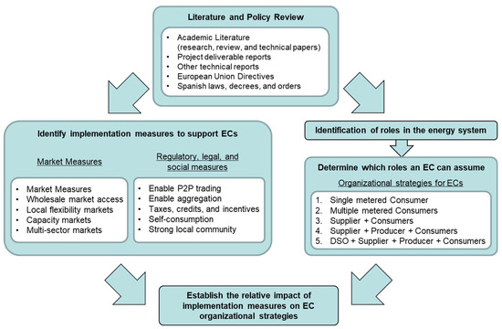 Using these references, we conceptualized Spain’s energy community ecosystem with the methodological approach depicted in Figure 1. The Figure articulates the roles of relevant entities and identifies which roles ECs can assume. Finally, a set of strategies to aid EC implementation developed and compared across the potential EC structures to identify the qualitative impacts of introducing different implementation strategies.