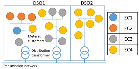 - Distribution System Operator (DSO): DSOs own and operate distribution networks (medium voltage (MV) and low voltage (LV) electricity networks). Their responsibilities are similar to those of TSOs: ensure the electrical supply quality, troubleshoot issues, maintain equipment, and measure electricity consumption [22,52];