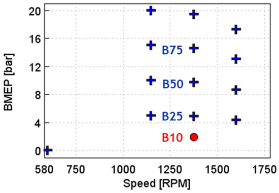 The numerical investigation was carried out at the 1375 RPM and 2 bar BMEP (B10) condition, as shown in Figure 2. For this study, a detailed one-dimensional (1-D) engine model representing the HD GCI engine was close-coupled with a three-dimensional (3-D) computational fluid dynamics (CFD) GCI combustion model. Prior to the close-coupling, 1-D and 3-D CFD models were calibrated and verified against GCI test data. The details of the models are discussed in the following sections.
