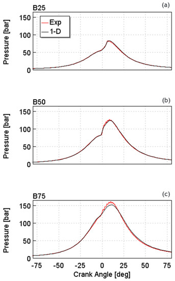 Figure 3 shows the correlation between the 1-D model predictions and the experimental RON93 gasoline combustion data at the (a) 5 bar BMEP (B25), (b) 10 bar BMEP (B50), and (c) 15 bar BMEP (B75) conditions (refer to Figure 2). The predicted in-cylinder pressure traces showed good agreement with the measurements.