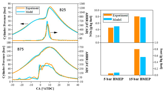 Comparison of cylinder pressure, apparent heat release rate (AHRR), and emissions between the experiments and model results at B25 and B75.