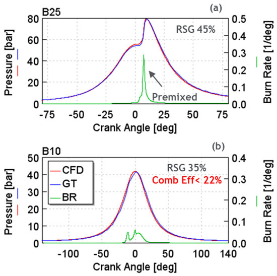 Figure 6a,b show the in-cylinder pressure correlations between the 1-D and the 3-D models at B25 and B10, respectively, under high in-cylinder total RSG mass levels. With the peak pressure and charge mixture boundary conditions match within ±2%, a successful close-coupling process was established.