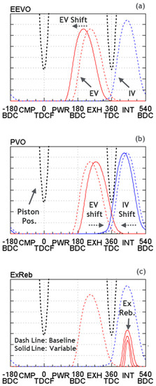 The EEVO strategy (Figure 7a), was applied by advancing the baseline EV event. This increased the in-cylinder charge temperature by enabling (1) an early blow-down of high-temperature in-cylinder exhaust gases and (2) a higher in-cylinder total RSG mass via an early exhaust valve closing. On the other hand, the EEVO strategy penalized indicated thermal efficiency (ITEg%) and gas exchange efficiency from the early blow-down of the in-cylinder exhaust gases and recompression of the trapped total RSG mass, respectively. For the present investigation, the EV event was advanced up to 40 crank angle degrees (CAD), as shown in Figure 7a.