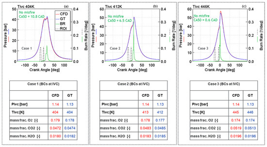 Moreover, for each Tivc case, the 1-D engine model predictions were compared with the 3-D CFD results. The 1-D model predicted in-cylinder pressure traces were noted within ±2% of the 3-D CFD results for Tivc 404 K, 412 K and 446 K as shown in Figure 8a–c, respectively. In addition, the air-thermal boundary conditions, including the in-cylinder pressure at the IVC (Pivc), Tivc, and the in-cylinder charge composition (CO2, O2, and H2O mass fractions) at the IVC, also correlated well between the 1-D and the 3-D CFD models (Figure 8).