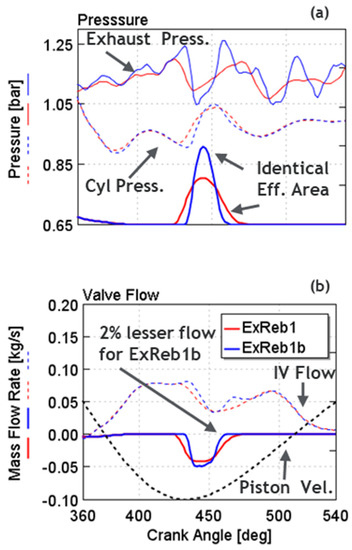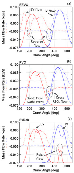 In part 2, using the 1-D engine model, VVA strategies, including EEVO, PVO, and ExReb (shown in Figure 7), were evaluated to achieve the Tivc targets of 404, 412, and 446 K. While delivering the Tivc targets, the corresponding total RSG mass was maintained to the level shown in Table 4. The three strategies were compared in terms of int.EGR requirement, EV and IV flow trends, in-cylinder temperature trend, air–fuel ratio (AFR) reduction, gas-exchange efficiency, and exhaust temperature increase as discussed in the following sections.