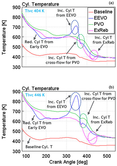 Variable valve actuation (VVA) is known to be an effective means to control the in-cylinder thermal environment. Traditionally, VVA is utilized for improving part-load fuel economy in spark-ignited (SI) engines by reducing intake throttling loss [17,18], and it has been studied for enabling high-efficiency, low-temperature combustion in compression ignition (CI) diesel engines [19,20,21,22]. In the past several years, there has been growing interest in utilizing VVA for thermal management, and various investigations have demonstrated its tremendous potential.