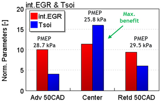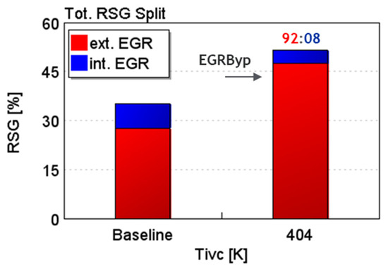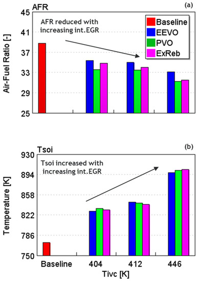 Figure 9 compares the resulting trapped int.EGR portions among the three VVA strategies that produced Tivc of 404, 412, and 446 K. For the baseline case, the int.EGR level is also shown for reference. As expected, increasing the int.EGR portion helped increase the Tivc from the baseline Tivc of 371 K that contained int.EGR portion below ~5%.