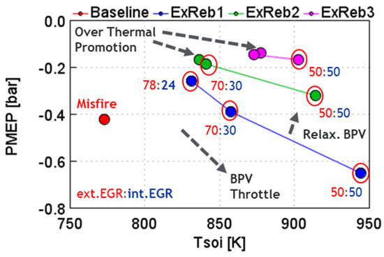 For ExReb, three different rebreathe strategies—ExReb1, ExReb2, and ExReb3—were applied (refer to Table 4), where the percent of the rebreathing profile lift to the main exhaust valve lift was implemented at 36%, 42%, and 50%, respectively. These ratios were determined by a design-of-experiments (DoE) campaign to achieve the Tivc 404, 412, and 446 K levels, while maintaining the BPV throttling identical to those for EEVO.