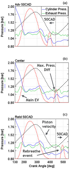 The PVO strategy, where the EV and the IV events were retarded and advanced, respectively, was applied to increase the overlap duration between the two events. An increased valve overlap duration increased the in-cylinder total RSG mass by allowing a cross flow of the exhaust gases from the exhaust port to the intake port. For this study, the EV and the IV events were shifted to the maximum allowed positions of the 30 CAD and the 15 CAD, respectively, under the constraint of the valve-piston contact limit, as shown in Figure 7b. In addition, the BPV was throttled to increase the total RSG mass level, when required.