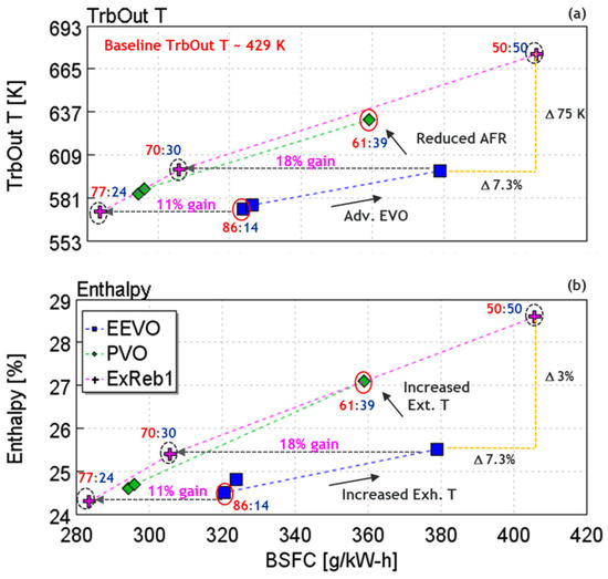 Comparison of all VVA strategies in terms of (a) TrbOut T and (b) exhaust enthalpy increase trends with respect to BSFC (for the elevated Tivc levels from Table 4).