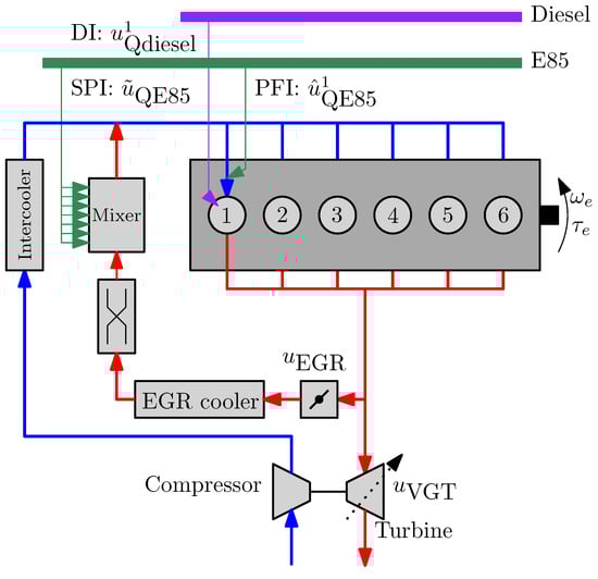 Figure 1 shows a scheme of the studied heavy-duty engine platform, which is based on a modern, six-cylinder EURO-VI diesel engine. This standard production engine is equipped with a common rail direct injection (DI) system for diesel and a cooled, high-pressure exhaust gas recirculation (EGR) system. For advanced dual fuel RCCI research, the following hardware changes are implemented:
