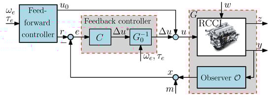 For each engine speed and requested engine brake torque , the feedforward controller gives the nominal control input settings and corresponding reference values r. These values are determined during an off-line optimization process and give the best trade-off between brake thermal efficiency and engine out emissions. In the literature, various methods are proposed to determine these optimal engine settings, see e.g., [,].