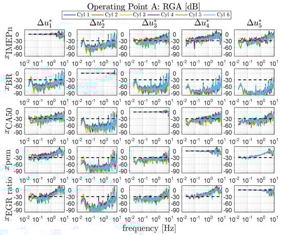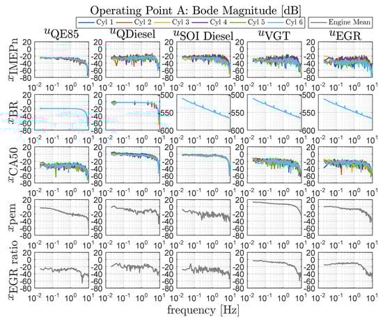Consequently, three unique, linear plant models , which capture the local system behavior, can be identified. Figure 4 shows the resulting FRF matrix for operating point A. In these experiments, we applied a zero-mean, multi-sine excitation u with random phase and 800 s duration. Excitation frequencies are chosen between 0.02 Hz and 10 Hz. Element of this matrix is the FRF, which corresponds to the m observed output (mentioned for each row) and the n control input (mentioned above each column). In the upper part of this figure, cylinder individual FRFs for and are plotted. It clearly illustrates that the combustion behavior varies for the six cylinders. This is attributed to the unequal distribution of the fresh air, EGR and SPI E85 mixture over the cylinders. Moreover, different cylinder wall temperatures can cause these variations, especially for the two outer cylinders. For the air path response, which is shown in the lower part of the figure, only a single (engine mean) response exists.