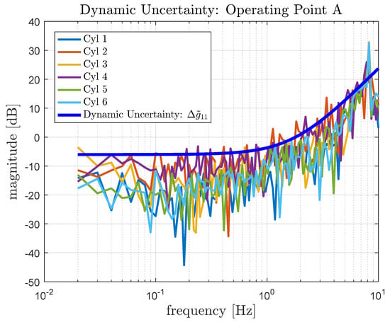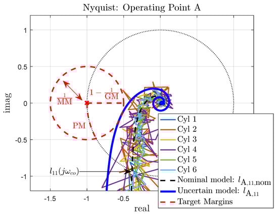 Using the uncertainty model, the feedback controller can be designed more systematically and efficiently; if the robustness margins are met for the uncertainty model, the individual cylinder controllers also satisfy the design criteria. More precisely, the loop gain is shaped for closed-loop stability, while dealing with robustness margins and performance. The latter is expressed by the cross-over frequency , which is a measure for the closed-loop bandwidth []. The applied control settings and resulting robustness margins are listed in Table 6 and Table 7, respectively. For operating point A, the corresponding Nyquist plot of is shown in Figure 7 for the next-cycle IMEPn controller. The model including uncertainty (in blue) clearly respects the target robustness margins. As illustrated in this figure, the six cylinder individual controllers also meet these robust performance criteria for these control settings. From additional analysis, it is also concluded that the designed controllers have good disturbance rejection properties, see also []. The Nyquist plot of and can be found in Appendix A. These figures illustrate that the stability criterion as well as the target robustness margins are met for all studied operating points. It is noted that the stability of the five-by-five closed-loop MIMO system can be analyzed by studying the characteristic loci, see e.g., []. This analysis also proofed that the closed-loop MIMO system is stable.