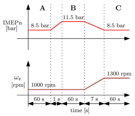 Test cycle around the three studied operating points for evaluation of transient RCCI engine performance. Reprinted from [] with permission of the International Federation of Automatic Control 2020.