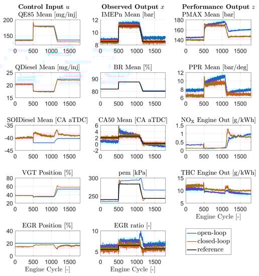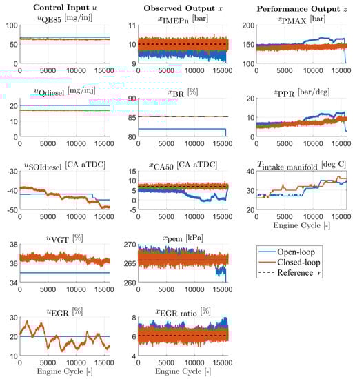 This figure clearly illustrates that the RCCI process is very sensitive for varying operating conditions. After changing the fuelling and air path settings around engine cycle 500, the observed outputs x differ from the desired reference values r in the open-loop control case. Especially, a drift in CA50 is observed, which converges to the desired stationary value in 500 engine cycles. This slow process is associated with engine heat up due to the increased engine load. As a result, in-cylinder temperatures increase, such that CA50 advances and both and increase. For , , and , this initial offset does not reduce. Stationary operating conditions differ from the reference values for the open-loop control settings. During transients, peaks in and are seen. This is mainly due to interaction between the fuel and air path control loops.