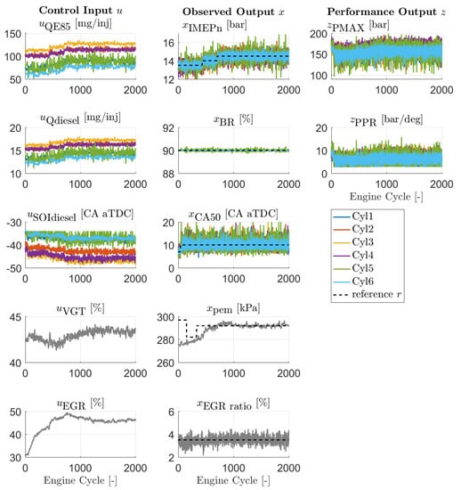 The closed-loop RCCI engine controller compensates for cylinder-to-cylinder variations and realizes the desired outputs x in all cylinders, as illustrated in Figure 11. More precisely, compared to the open-loop control case, cov(IMEPn) is reduced from 9.2% to 2.8%, whereas cov(CA50) remains small: 0.5%. Cylinder balancing indirectly leads to similar and values in the six cylinders. The cylinder-to-cylinder variations are reduced by 33.6% and 11.6%, respectively, due to next-cycle combustion control.