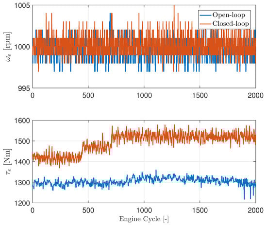 For the closed-loop control case, the increased safety margins are used to further extend the engine’s maximal load range. By manually changing the reference values r, the RCCI engine can be operated at higher loads, while still meeting the safety and noise constraints for and , as defined in Table 4. In open-loop control mode, a maximum load of Nm (BMEP = 12.9 bar) is achieved, while the closed-loop controlled RCCI engine is able to run at Nm (BMEP = 14.8 bar), see Figure 12. This 14.7% increase in RCCI load range clearly illustrates the potential of the proposed closed-loop RCCI engine control.