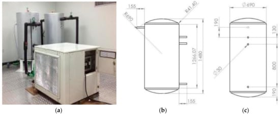 The geometry of the storage tank: (a) The experimental facilities for testing the heat pump performance; (b) Front view of the storage tank (unit: mm); (c) Side view of of the storage tank (unit: mm).