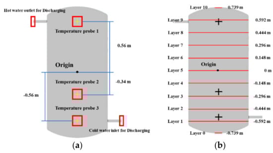In the actual tank configuration, there were three temperature probes installed at the tank’s center diameter, as shown in Figure 2a. To investigate the degree of temperature stratification, the tank model was divided into 10 layers to obtain the temperature of each water layer which was used to calculate the dimensionless terms and the discharging efficiency, as presented in Figure 2b.