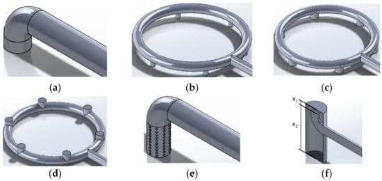 The geometries of the modified inlet pipes: (a) Direct downward model; (b) Annular inlet I model; (c) Annular inlet II model; (d) Annular inlet III model; (e) Perforated pipe model; (f) Equalizer I-IV models.