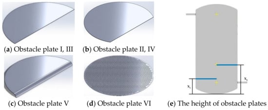 The geometries of the obstacle plate models: (a) Obstacle plate I and III models; (b) Obstacle plate II and IV models; (c) Obstacle plate V model; (d) Obstacle plate VI model; (e) The height of obstacle plates installation.