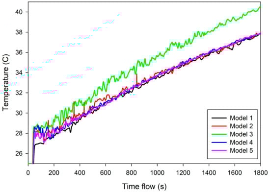 The finite element method (FEM) employs small particles, called “mesh element,” to solve the problem in accordance with the governing equation. The precise results referred to the Navier–Stokes equation, which can be obtained from smaller mesh elements. Nevertheless, the calculation with smaller mesh elements consumed a considerable amount of memory and long simulation time. Thus, mesh independence is an important concept to optimize the mesh element size and to achieve the best solution time. Figure 5 presents the water temperature calculations from each mesh model during the heating period. The mesh elements of the mesh independence analysis are summarized in Table 3.