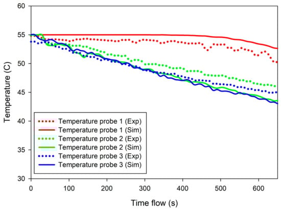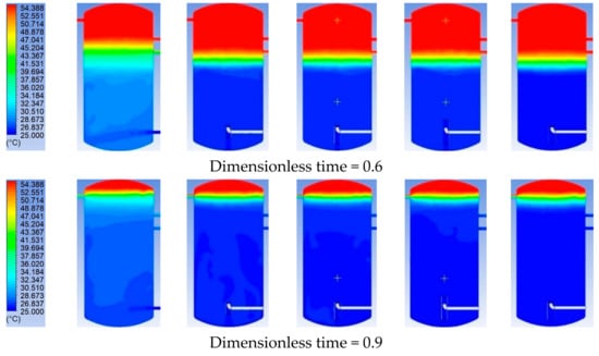 The result was shown that the simulation results corresponded well with the experimental data, as shown in Figure 7. An average deviation between the experimental results and the simulation results was less than 3%, as presented in Table 4. Therefore, the simulation model was accurate for studying temperature stratification in the storage tank.