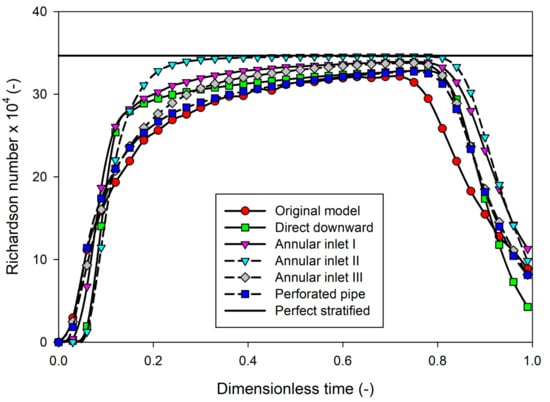 To compare the effect of outlet numbers, the direct downward model and the perforated pipe model were considered, and it was found that the direct downward model had a better Richardson number than the other when the dimensionless time was 0.0–0.6. After a dimensionless time of more than 0.6, the Richardson numbers of both models were the same because the direct downward model induced the turbulence occurring at the lower part of the tank, which resulted in a temperature stratification increase. Moreover, the use of perforated pipe could not improve temperature stratification during a dimensionless time of less than 0.7, when compared to the original model. The thermal stratification in the perforated pipe model was obvious when the dimensionless time was more than 0.7.
