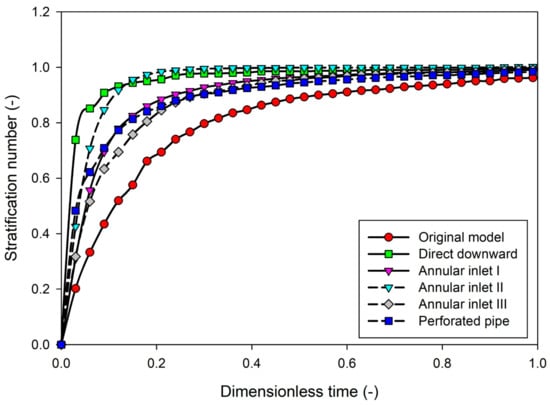 Figure 9 presents the stratification number for all modified inlet pipe models. The results showed that the stratification number had the same tendency as the Richardson number. The annular inlet II model reached the stratification number of 1.0 faster than the other models at the dimensionless time of 0.3, which denoted a narrow thermocline and clear stratified temperature in the tank. However, the stratification number of the perforated pipe model was not consistent with the Richardson number when compared with the original model due to the perforated pipe showing a higher stratification number than the original model since the beginning of dimensionless time. By using only these two indicators, it was difficult to identify thermal stratification magnitude in the thermal storage tank clearly. Therefore, the temperature contour analysis and the velocity profile were necessary for future discussions.