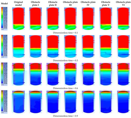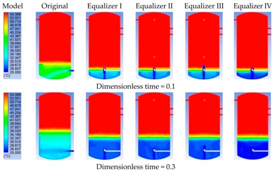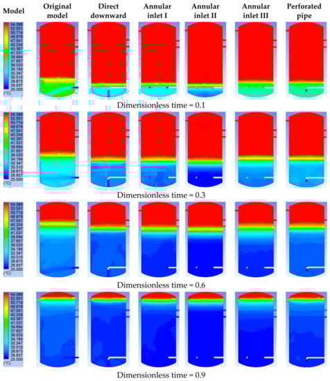 Figure 10 and Figure 11 show the modified inlet pipe models’ temperature contours and velocity profiles. Data from original model and annular inlet II model were used for preliminary comparison in previous work [14]. The results of the temperature gradient illustrated that the stratified temperature and a layer of thermocline in the annular inlet II model were distinct and rapid, compared to other models, as evidenced at a dimensionless time of 0.1. The cold temperature water settled in the bottom part of the tank due to the low-velocity distribution resulting from low turbulent mixing. For the perforated pipe, the stratification number was higher than the original model at the initial stage of the discharge period, but the temperature gradients were not significant between these two models. A wider spread of flow turbulence throughout the bottom and intermediate parts of the tank resulted in a higher average temperature for a nearby layer than shown by the original model, thus causing a higher stratification number.