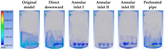 Table 1 describes the geometry of the modified inlet pipe models. The model configurations are shown in Figure 3. For the direct downward model, an inlet pipe with a 30 mm diameter, the same as the original model, was inserted through the shell tank and into the center in a downward direction. Even though the inlet water velocity of this model did not decline, the change in the flow direction helped to destroy the kinetic energy and resulted in lower turbulent mixing. In the annular inlet model, the concept with several outlets widely distributed throughout the tank diameter was adopted to reduce the incoming stream velocity, as did the designs with perforated pipes and equalizer models. For the equalizer model, the equalizer’s height, diameter, and distances (x1 and x2) were altered to investigate the effects on temperature stratification.